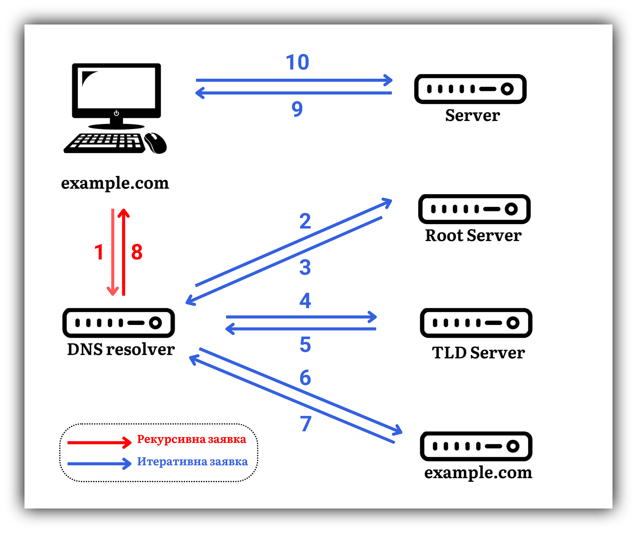 - И накрая, DNS резолверът изпраща заявка до сървъра където се намира домейн името example.com